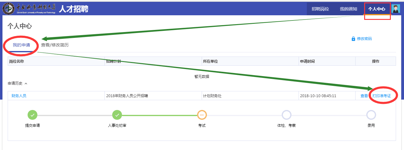 2018年我校财务人员招聘笔试定于2018年11月4日上午9:00-11:00进行,注意事项和要求详见准考证。请资格初审通过人员于2018年10月26日-11月2日期间登录我校人事处网站“人才招聘-招聘系统”(http://zp.csuft.edu.cn/)进入“个人中心”打印准考证
